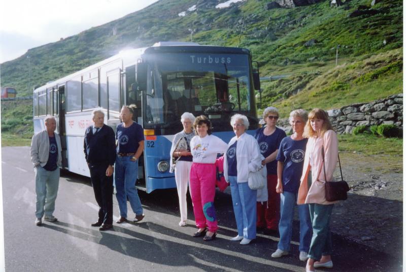 Sangkoret på utflukt en gang på 1980-tallet. Fra venstre: Knut Knutsen, sjaføren, Egil Larsen, Arnlaug Ebbestad, Kirsten ?, Gerda Johansen, Karin Eek Iversen, Synnøve Furustad, ukjent