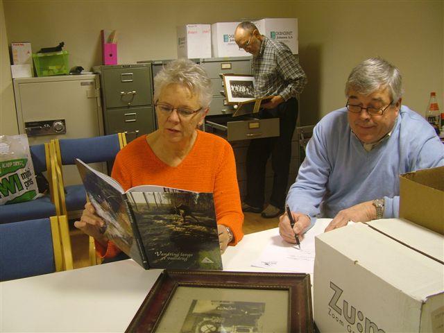 Historielagets nye kontor som ble åpnet i nov. 2006. På bildet : nestf. Toril Naper Hauge og sekretær Per Runar Thoresen. Bak står Oscar Hauge med bildearkivet.