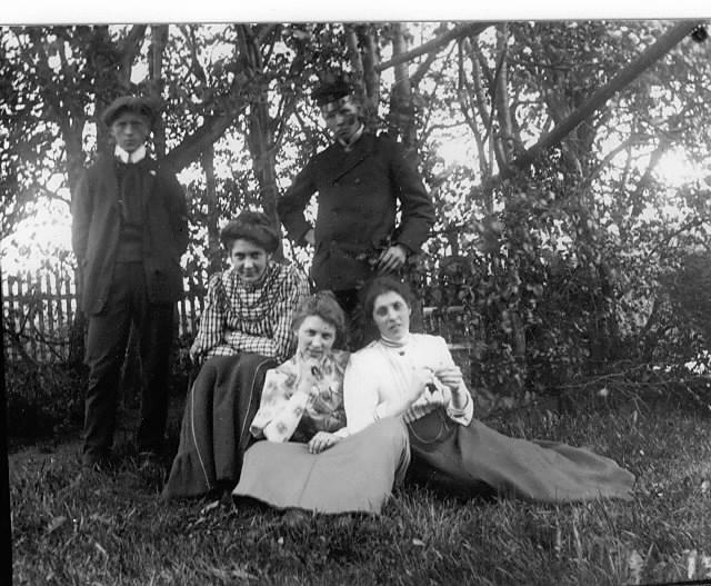 Karen, Agot, Thora, Bjerck og Braathen i hagen på Stormoen