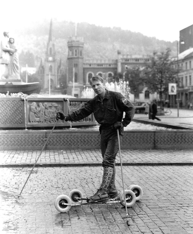 Helge Amundsen, Skoger IL, med sine rulleski på Bragernes torg. Bidet er tatt etter at Helge hadde gått på rulleski fra Larvik til Drammen på 7 t. Dette var et veddemål som han klarte, selv om de siste km. var seige. Rulleskia veidde 5 kg. og hjula var luftfylte. Helge var sønn til Hilda og Einar Amundsen på Garås.