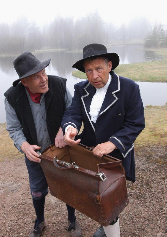 Hichmann demonstrerer at kassa er tom. Konnerudverket er konkurs. Fra v.: forfatter og skuespiller Kai Roger Olsen og Jan Sundby Ekeberg.