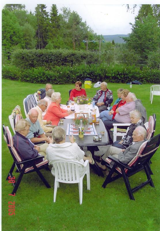 Konnerud tre og flis sitt grillparty. På venstre side av bordet: Bjørg og Kristian Langerød, Hans Haveraaen, Astrid Ringstad, Anne - Lise Prøys, Rolf og Ann Vera Svenson. videre på andre siden .: Arvid Stubberud, Inger Stubberud , Åse og Borgar Echoldt, Åsne og Kåre Knutsen
