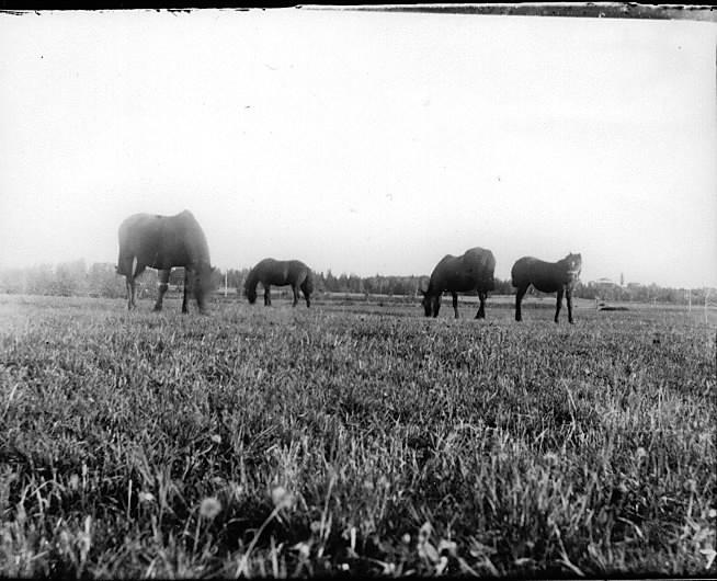 Hestene på Syrstad. Granheim og Walterborg i bakgrunnen
