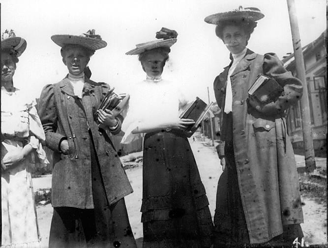 4 skolevenninner: Kristine Christensen, Karen Ellingsen, Margit Rølles og Marie Klemmetsen. Bildet er tatt i Nedre Storgt. Bragernes. ( ved Sundgt eller Gjetergt.)