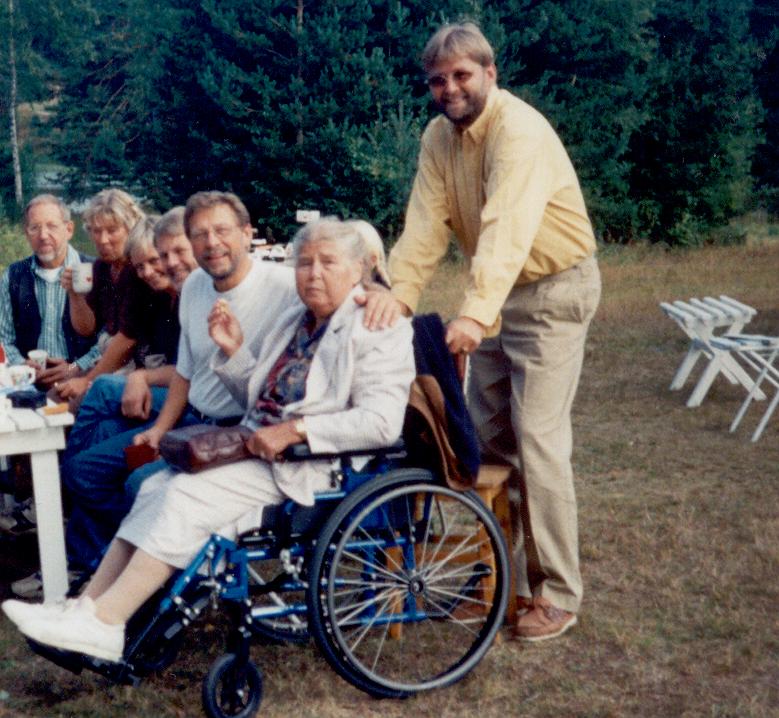 Samling på gården til Goro og Kristoffer Halden ( Vestmansbråtan ) etter forestillingen om Ole Høiland. Fra v.: Kjell johansen, Betty Sønsterød, Gry Strøm Andersen. Kai Roger Olsen, Jan Sundby Ekeberg, Aslaug Rypaas ( i r.stol ) og sønnen Ola Rypaas