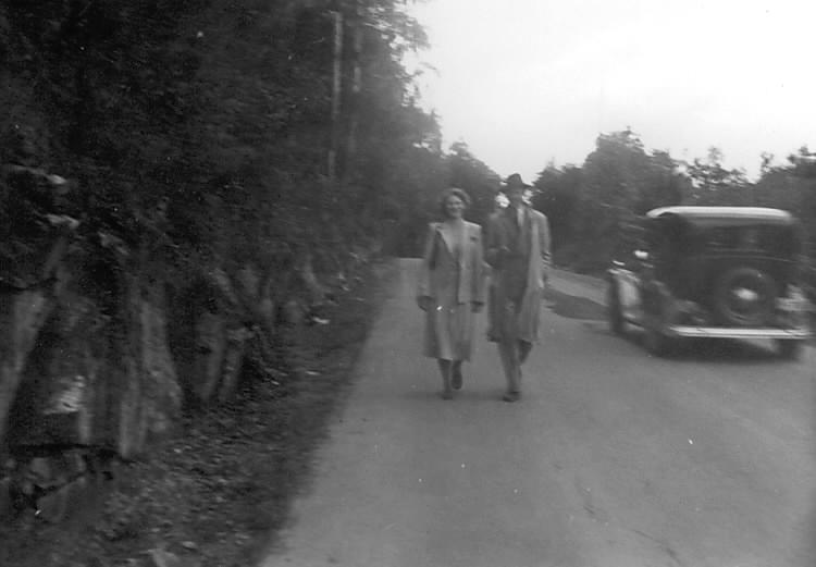 Solveig og Thorbjørn Tollefsen på spasertur til Drammen. Bildet er tatt i Konnerudbakken. Legg merke til veiens beskafenhet og bilen som er på veg til Konnedrud.