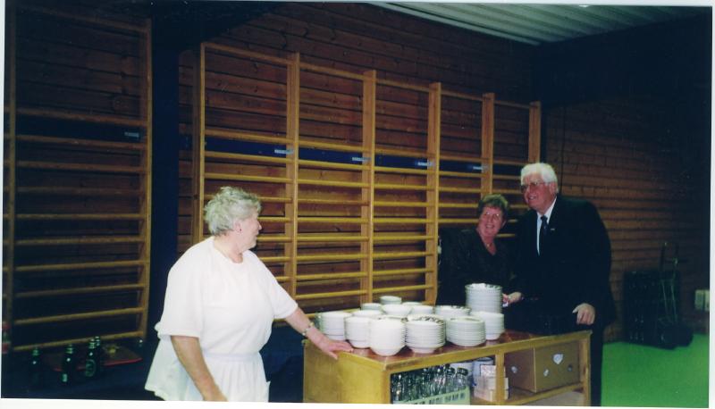 Lise og Svein Johansen og Karin Aass (t.v.) foran baren Kiwais Club Konnerud sin gave til 75 års jubilanten var serveringen ellers. (Lise, Svein og Karin er ikke medlemmer i Kiwanis)