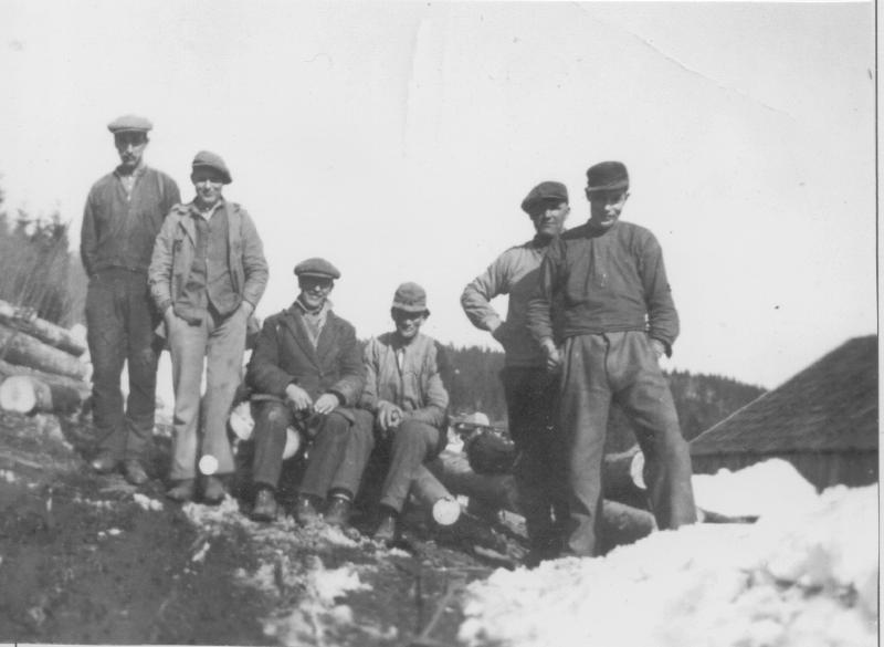 Manskap for skjæring av tømmer. Fra v. Sigurd Eriksen - Kåre Larsen f. Foskollen. - u - Halvor Skjeldrum ( kantmester ) - Karl Larsen - Harald Springover Johansen Det var så lite strøm på den tiden at de måtte skjære tømmeret om natt for at bøndene skulle strøm på dagtid.