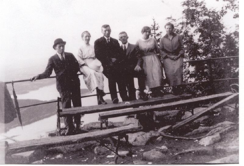 Fra v. Martin Haugen . Gulbjørg gift med Johan Halden, Johan Halden . Olav Echholt . Klara Echholt gift med Joseph Echholt . Marta Echholt. Bildet er tatt på en tur fra Konnerud til Kongens utsikt. Reisen var lang. Tog fra Drammen til Lierbyen, så videre med toget til Svangstrand ( Lierbanen ). Båt til Sundvollen og kanskje hesteskyss derfra til Kongenss utsikt. Klarte de denne turen på en dag ? Red. anm.