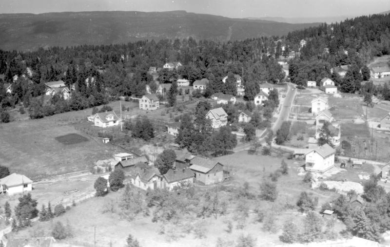 Bernåsbakken og Postsvingen på Konnerud i 1955. Gården i forgrunnen er Tverkholt som i sin tid ble eid av Johannes Skjeldrum som kom fra Øvre Skjeldrum i Skoger.