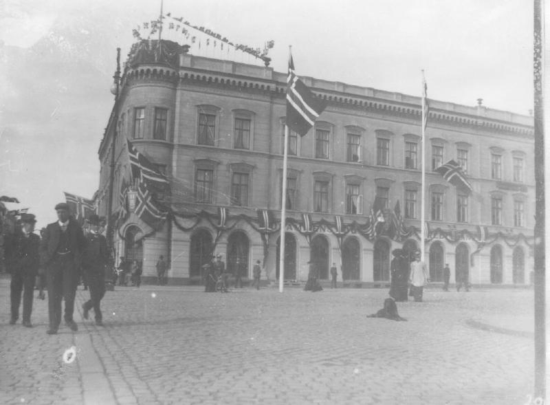v/ Drammen og Oplands Privatbank. Kong Haakons besøk i Drammen