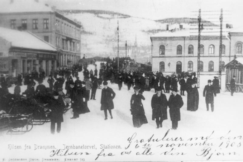 “Jernbanetorget - Strømsø torg,” Skoger og Konnerud historielags bildesamling, besøkt 26. februar 2026, https://www.skhist.nettsidetesting.no/items/show/5026.
