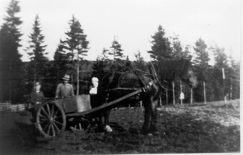 Potetopptak på Haugen - Konnerud 1940 Fra v. Ragnar, Johan og Gudbjørg Halden