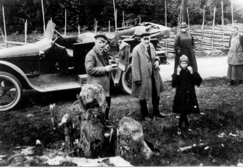 Første bil på Konnerud. Fra v. ukjent, Victor Hoff, Liten pike,ukjent, ukjent til h. Asta Hoff
