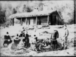 Fra v: Øyvind Pedersen. Kåre Ringstad. Andres Råen. Harald Hindhamar. Peder Ringstad. Helge Furuvold. bak fra v.: Lorang Holtan og Olaf Haveråen Den nye hytta på Prestesetra ble bygd av Johan H. Andresen (Tiedemanns Tobakksfabrikk) etter at han hadde kjøpt Selvik Bruk. Det var en tømmermester fra Sandefjord som satte opp hytta under krigen. Den sto i hvert fall ferdig i 1944. Det ble bygd en mindre hytte noe til høyre for denne sett nedenfra vollen. Der bodde de som bygde den store under byggeperioden. Navnet Prestesetra kommer av at presten i Sande kunne benytte den gamle hytta som opprinnelig lå noe lenger ned på vollen. Den er borte forlengst. (2013) Prestesetra var i bruk frem til 1980