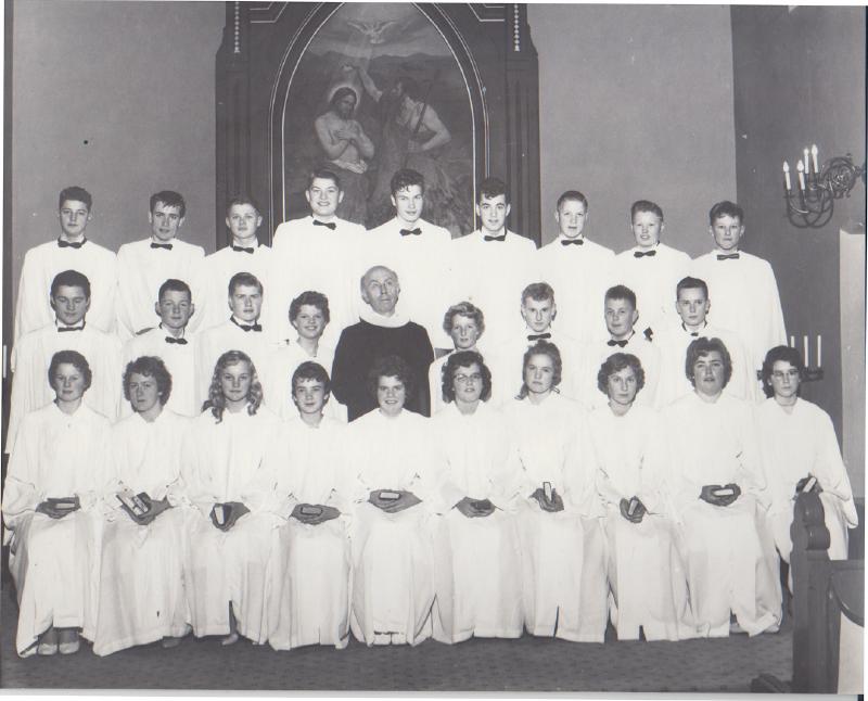 Fra venstre 1. rekke foran: ?, ?, ?, ?, ?, Jorunn Aaserud, ?, ?, ?, Marit Kaspersen, Fra venstre 2. rekke: John Johnsrud, Erling Havik, Runar Olufsen, Turid Beheim, Presten Engeland, ?, ?, ?, ? Fra venstre 3. rekke: ?, ?, ?, Håkon Rud, ?, Knut Ole Røed, ?, Jacob Fretheim, Tekst: Torill Juel