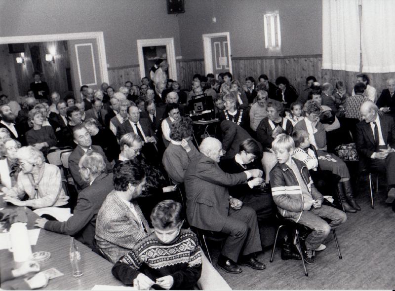 Filmkveld på Skogvang 4. desember 1988. Muligens Holger Halkjær som viser lokale filmopptak Bygdekino var det på Skogvang på 1960-70 tallet.