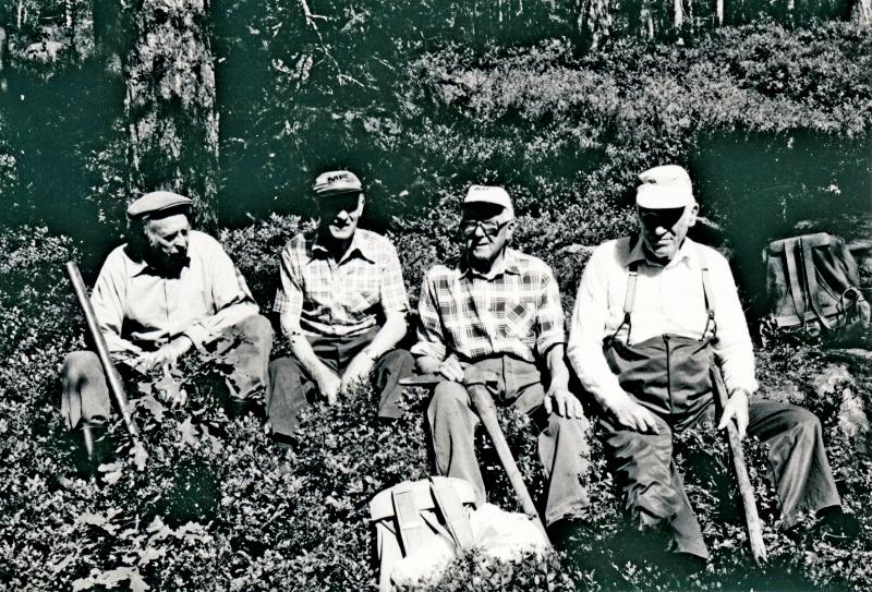 Pensjonistforeningens dugnad langs Pensjoniststien på Tolerudåsen. Her en pust i bakken på “Markusplassen”. Personer på bilde fra venstre: Markus Johnsrud, Bjarne Steen, Bjarne Thoresen og Hans Steen.