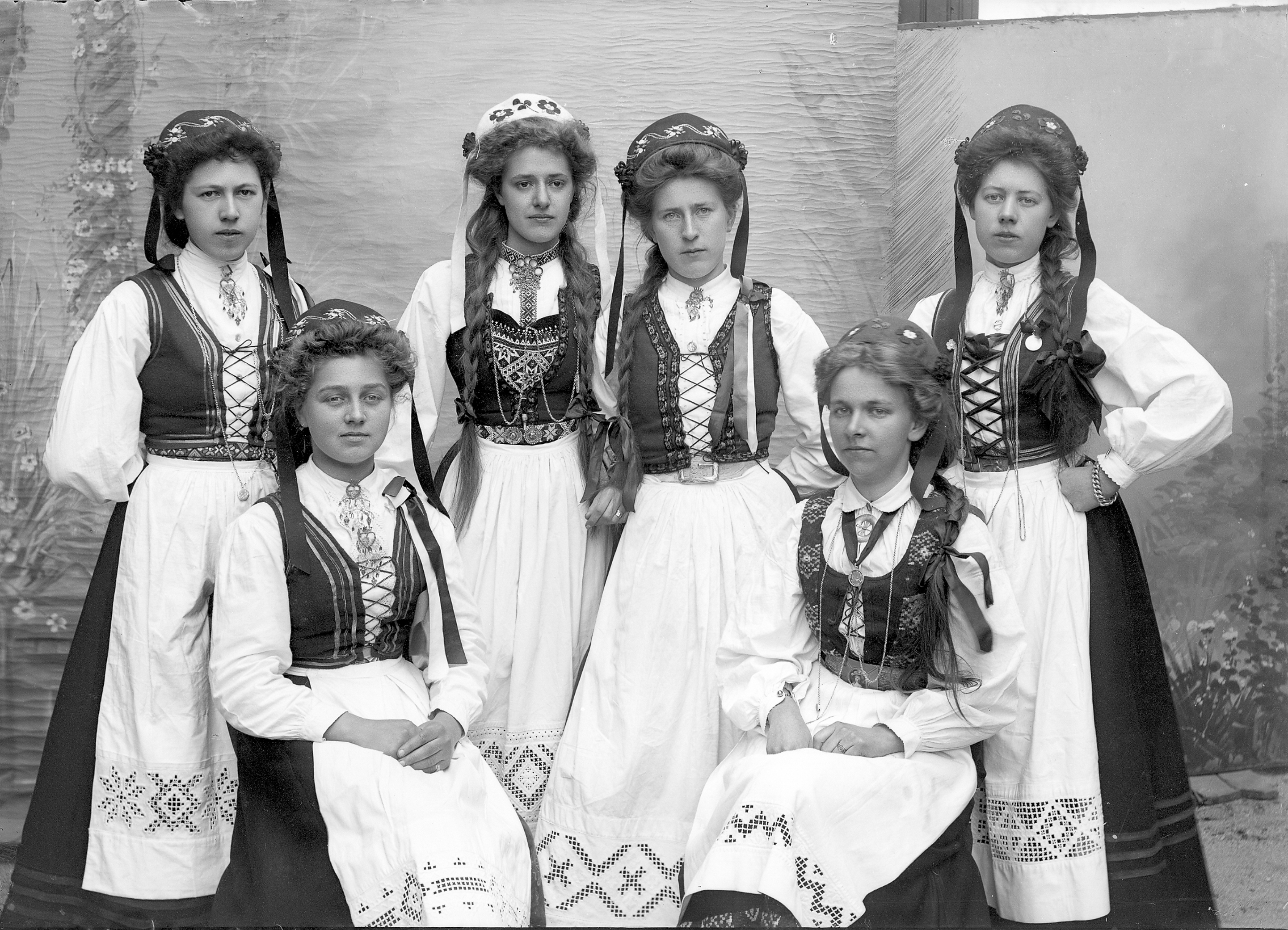Glassplaten er skannet og behandlet av Fotohuset, Drammen. 17 mai 1914 - Grunnloven er 100 år. Sittende foran. Ingeborg Andersen, gift Karlsen. Elise Gulliksen, gift Karlsen. Stående bak: Karoline Lillås, Helga Christensen, gift Trogstad, Magrerthe Olsen, Herborg Langback