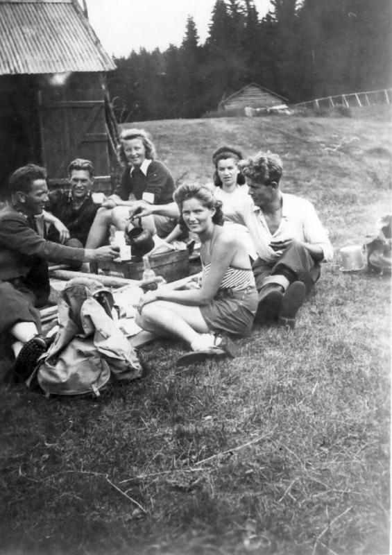 Hyggetur til Skulkerud. Foran fra v.: Henry Pedersen, Ella Pedersen Bak: Arvid Ruud ,Ester Ruud, Ingrid og Einar Blomholdt