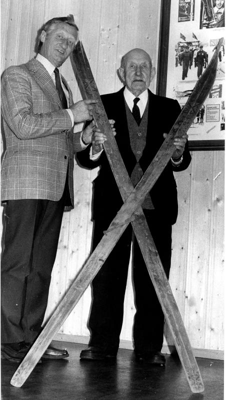 Oskar Mortensen og Bjørn Skalstad (med skiene) på KIL's klubbhus på Sletta. Skiene ble gitt i gave til KIL og heger på klubbhuset.