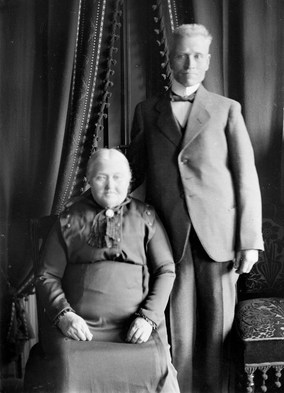 Glassplaten er skannet og behandlet av Fotohuset, Drammen. John Monsen Gram f. 1845 d. 1929 og hustru f. Hatleberg, fra Borgund i Sogn. De bodde først på Stensmyren i N. Eiker. I 1911 ljøpte de b.nr 3 av Langum, " Eriksbrøten ", som de solgte igjen i 1917. De hadde 7 barn.Ett av dem Ole Gram var kjøpmann i Rødgt 1. Fotograffens besteforeldre eide dette huset tidligere. Oles sønn Arthur drev som kjøpmann her i mange år. Huset bøe revet i 1980.og et nytt bygget i Rødgt. 1Bl. a. er barermester John Gram barnebarn av John Monsen Gram. De har mer etterslekt i Drammen, Oslo, Tønsberg, Konnerud