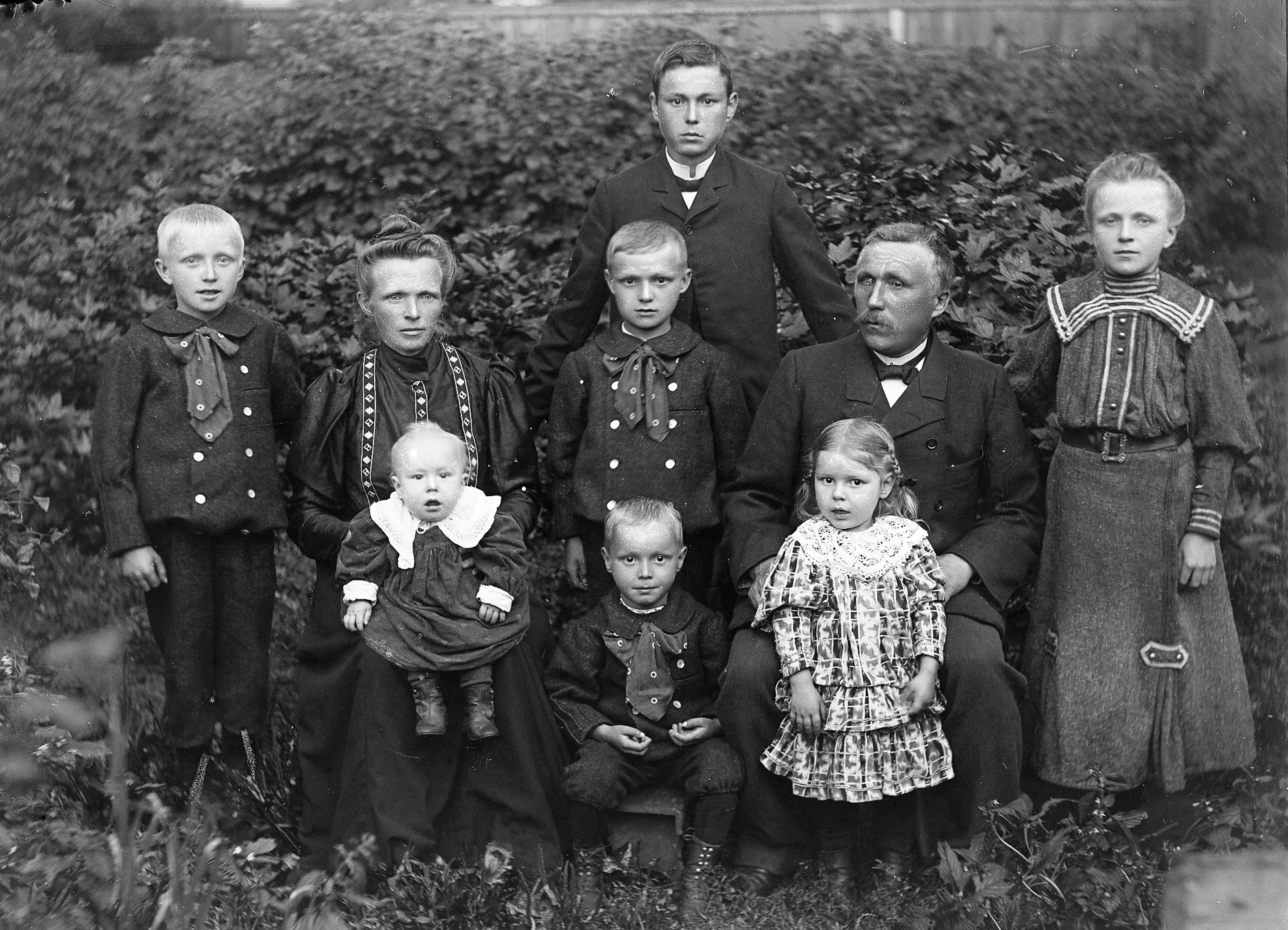 Glassplaten er skannet og behandlet av Fotohuset, Drammen. Thorvald og Bolette Nicolaysen m/ 7 barn, Harry, Anna, William, Einar, Nils, Dagmar, Fanny .(Thorolf er antakelig ikke født enda)
