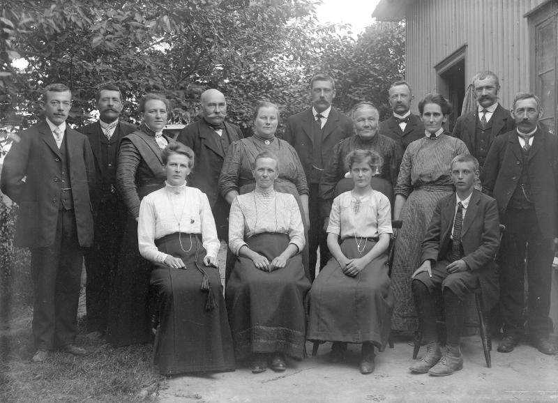 Glassplaten er skannet og behandlet av Fotohuset, Drammen. Johan Johannessen nr. 4 fra venstre bak, hans kone nr 7 fra venstre bak.