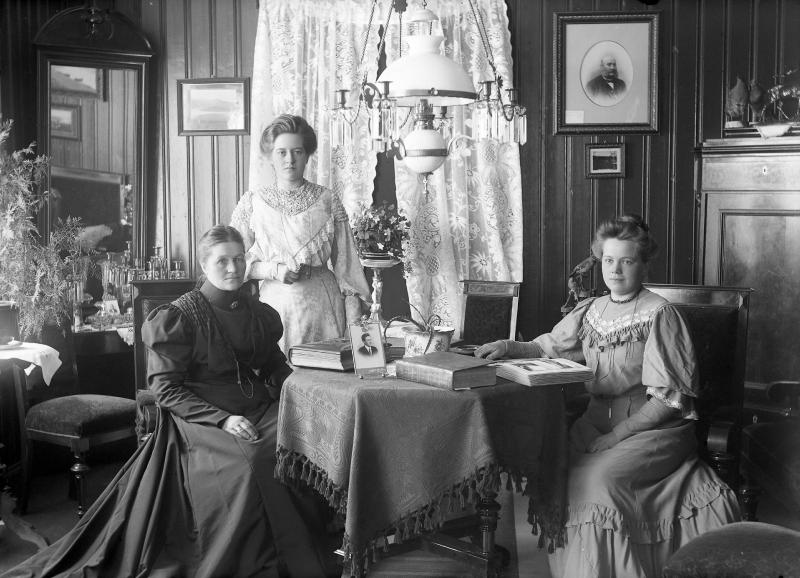 Glassplaten er skannet og behandlet av Fotohuset, Drammen. Frk Røgeberg, fru Røgeberg , Interiør Hvittingfoss