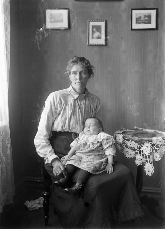Glassplaten er skannet og behandlet av Fotohuset, Drammen. Marie Helgerud . Rødgt.20, med minstebarnet. Marie er i slekt med fam. Halvorsen påStubberud, en av Konneruds elste slekter.Mannen het Martinius Helgerud og har navn etter Helgerud plassen ved grnsen mot Nedre Eiker. Han er f. på Nysetra, langt inne på skauen. Tre sønner, Bjarne, Birger og Arvid, som siden reiste til Canada.