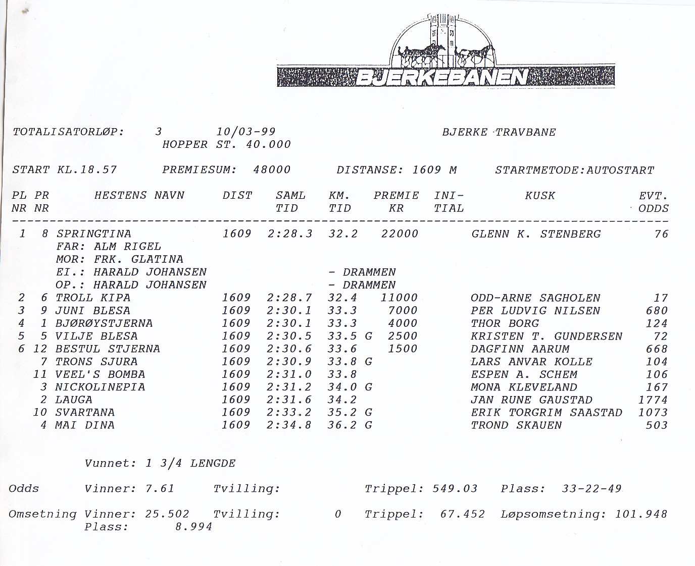 Harald Johansen's Springtina, 1. pr. Bjerke 1999