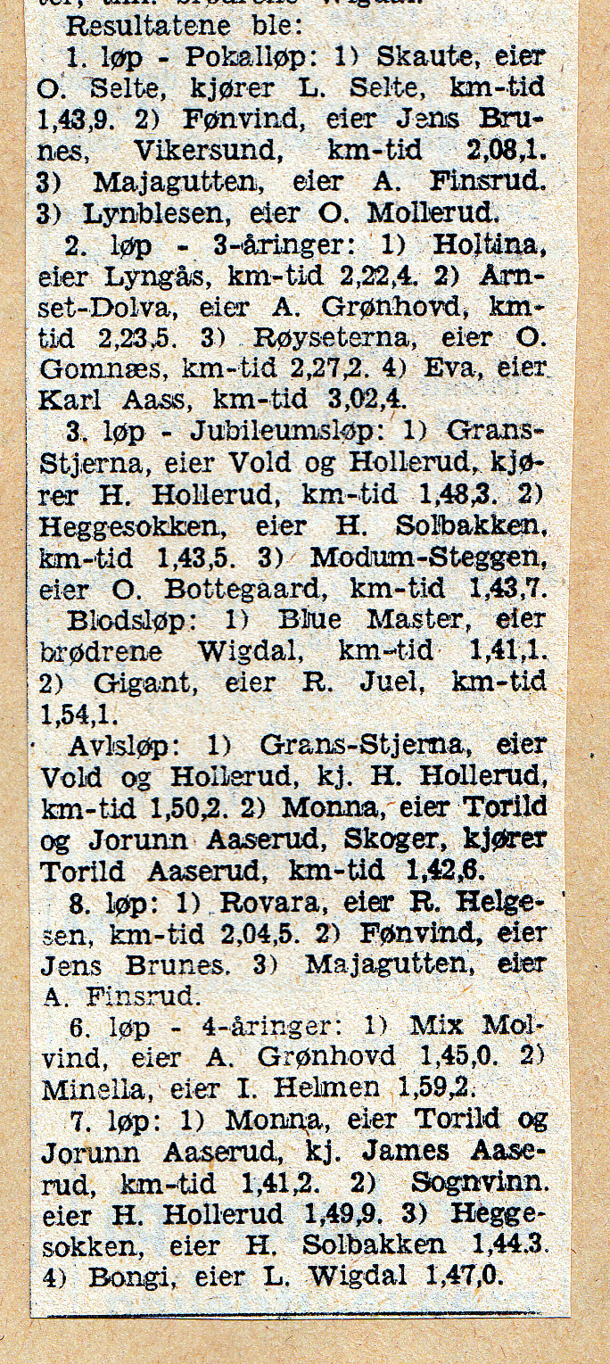 Flere Skogerhester var med her : I 1. løp ble Majagutten med kusk og eier Arne Finsrud nr. 3 I Blodsløpet ble Gigant med kusk og eier Ragnar Juel nr. 2 I Avlsløpet ble Monna nr 2, kusk og eier Torill Aaserud I 7. løp vant Monna og ble raskeste norske hest der med kmtid 1.41.2, kusk James Aaserud I 8. løp ble Majagutten, kusk og eier Arne Finsrud nr. 3 Se resultatlista fra DT