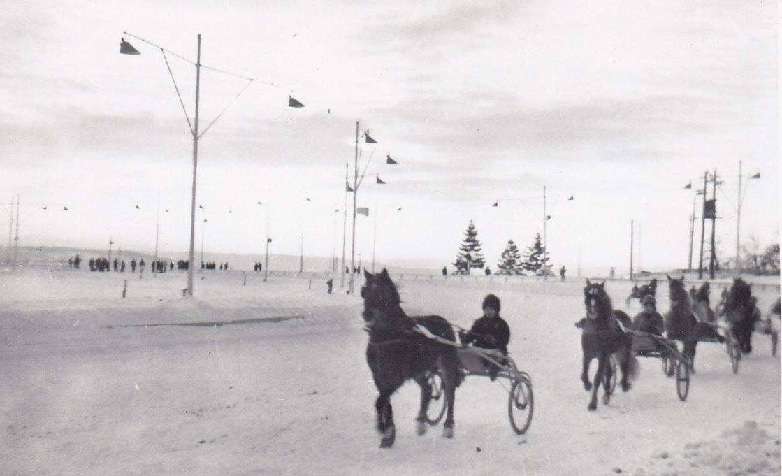 Defilering til iskjøring på Drammen Travbane i 1962. På iskjøring fikk jenter også lov til å kjøre i løp sammen med mannfolka. Gutter kunne kjøre både på iskjøring og ellers. Først på bildet her er "Monna" med Torill i sulkyen. "Monna" ble født på Vestre Aaserud 1954, far "Molvin" og mor "Dolla". Torill og Jorunn Aaserud står som eiere av henne.