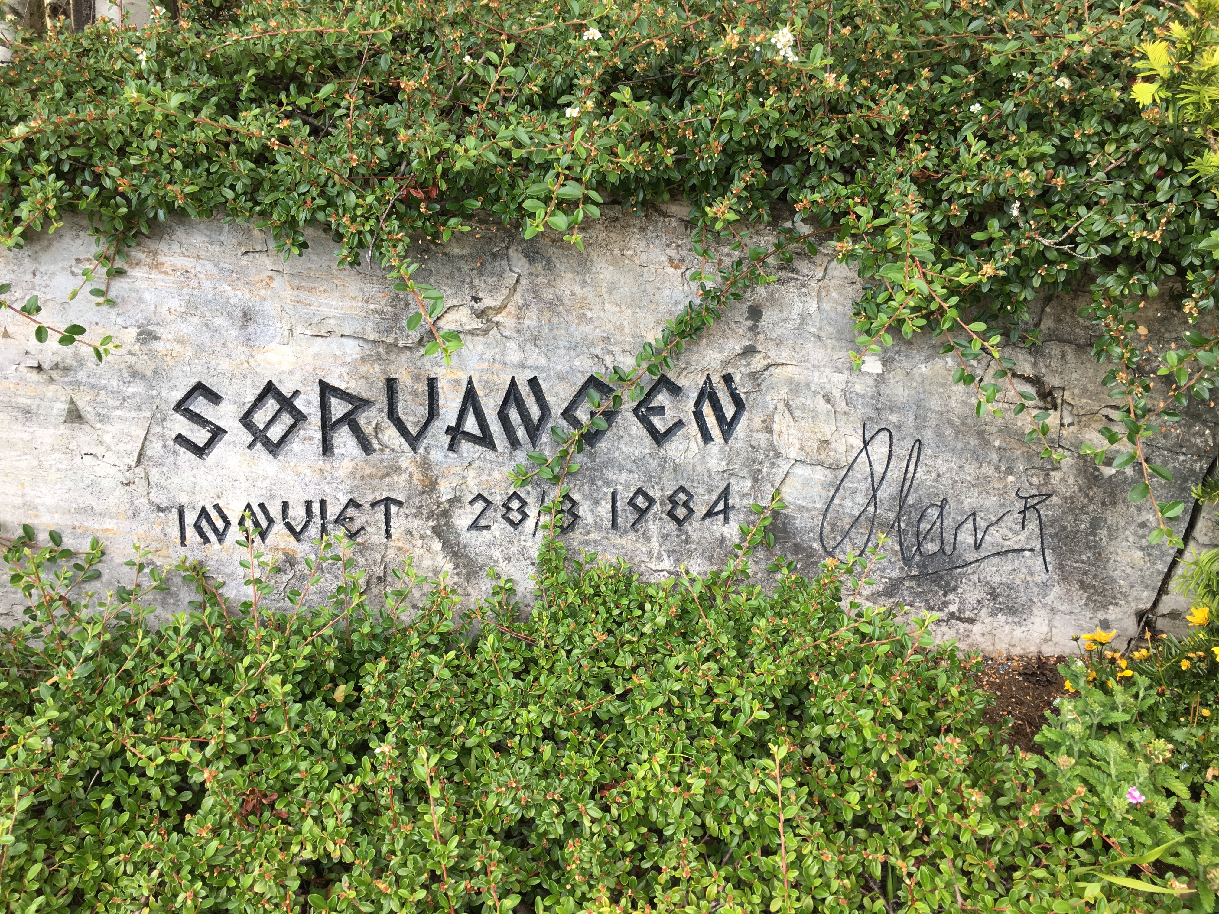Kong Olav V åpnet Sørvangen 28. august 1984, og han skrev navntrekket sitt her.